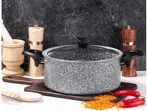 Alüminyum İç ve Dış Granit Etkisi 2 Yıl Garantili 11 Litre Çizilmelere Karşı Dayanıklı İç Yüzey Buhar Delikli Cam Kapak Isınmayan Bakalit Kulplar Granit Görünümlü İç ve Dış Kaplama Alüminyum Ezme Kesinlikle PFoA (Kanserojen) İçermez Ağırlığı 2700 gram Ultra Granit Derin Tencere 32 Cm