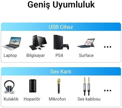 USB 2.0 to 3.5mm Ses Kartı, bilgisayar, Notebook, Microsoft Surface Tablet, PS4 ve PS5 cihazlarınızdan ses çıkışı alabilirsiniz ve mikrofon girişi sayesinde ses kaydı yapabilirsiniz. TRS desteği sayesinde üzerinde bulunan 2 adet 3.5mm Jak girişinden mikrofon, kulaklık veya headset kullanabilirsiniz. Oyun oynarken, müzik dinlerken veya online görüşmeler yaparken bu ses kartı ile kristal netliğinde ses kalitesi sunar. Örgülü dokuma ve alüminyum alaşım yapısı sayesinde uzun ömürlü kullanım yapabilirsiniz. Model: V-K103 Renk: Siyah Giriş: USB 2.0 Çıkış: 3.5mm Jak Malzeme: Örgülü dokuma + Alüminyum alaşım Uyumlu sistemler: Windows,MacOS, Linux USB Ses Kartı 3.5mm Kulaklık ve Mikrofon Girişli Siyah