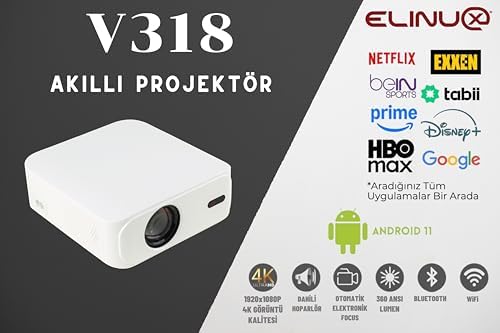 V318 11 Projektör, 1080P Çözünürlük, 360 ANSI Lümen, Otomatik Focus, Wi-Fi 6, Bluetooth 5.4, 4K, Otomatik Düzeltme, 60-200 inç Görüntü, Beyaz