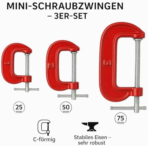 Bu vidalı mengene seti üç küçük C şeklinde vidalı mengeneden oluşur. Sağlam demirden üretilmiştir ve bu nedenle çok sağlamdır. Vidalı mengenelerin boyutları 0 – 25 mm, 0 – 50 mm ve 0 – 75 mm'dir. Mini vidalı mengene — 1 x 25 mm — 1 x 50 mm — 1 x 75 mm — C şeklinde Teslimat kapsamı: 1 x 3 parçalı mengene seti Vidalı mengene 3'lü set 25 mm, 50 mm, 75 mm
