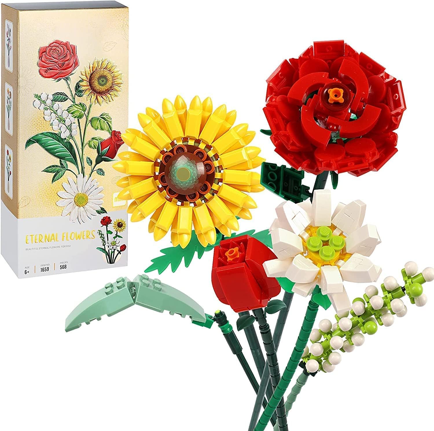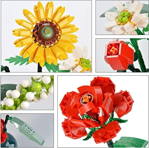 VRBFF Çiçek Buketi Yapı Seti, Yapay Gül Çiçekleri Yapı Taşları, Kendin Yap Benzersiz Dekorasyon Ev, Botanik Koleksiyonu (568 ADET (Ayçiçeği/Gül//Papatya))