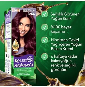 6 haftaya kadar kalıcı yoğun renk ve sağlıklı görünüm En dirençli beyazlarda bile mükemmel beyaz kapama Yoğun renk pigmentleri Wella Koleston Naturals Saç Boyası 3/66 Kızıl Kestane