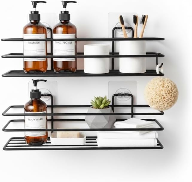 Yapışkanlı Siyah Banyo ve Mutfak Rafı – Tek Katlı Düz Şampuanlık ve Baharatlık, Delmeden Montaj, Matkap Vida Gerektirmeyen Su Geçirmez Duvar Organizeri (2 Adet)
