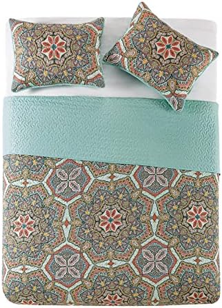 5 Parça Kral Yorgan Seti İçeriği: (1) Yorgan (264 cm x 228 cm), (2) Yastık (50,8 cm x 91,4 cm), (2) Dekoratif Yastıklar (30,48 cm x 40,64 cm, 40,64 cm x 40,64 cm) BOHO CİHAZLI TERS YORGAN: Bir arada iki canlı görünüm – bohem stiline yeni bir bakış için çok renkli kaleydoskop baskıları ve küçük açık mavi madalyonlar arasında geçiş yapın. YUMUŞAK MİKROFİBER: Rahat bir his ve kalıcı konfor için ultra yumuşak polyester mikrofiberden üretilmiştir. HAFİF YIL BOYUNCA KONFOR: Aşırı ısınmadan nefes alabilir ve rahat – sıcak uyuyanlar veya mevsimler boyunca katmanlama için idealdir. SOLMA, KIRIŞIKLIK VE HAPA DAYANIKLI: Dayanıklı mikrofiber kumaş renkleri canlı tutar, kırışıklıklara ve tüylenmeye karşı dayanıklıdır ve yıkandıktan sonra taze bir görünüm sağlar. BAKIM TALİMATLARI: Yorgan ve yastık kılıfı kolay bakım için makinede yıkanabilir. Makinede soğuk, hassas programda ayrı yıkayın. Düşük sıcaklıkta kurutun. Çamaşır suyu kullanmayın veya ütülemeyin. Dekoratif yastıklar: sadece nokta temizliği. MEMNUNİYET GARANTİSİ: Ürünlerimizi bizim kadar seveceğinize ve Amazon üzerinden kolay iade sunacağınıza inanıyoruz. | Yara Koleksiyonu | Yorgan Seti – Ultra Yumuşak Ters Çevrilebilir Örtü Yatak – Hafif, Havalı ve Nefes Alabilir Yatak Örtüsü,, Aqua, 3 Parça